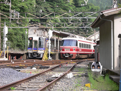 極楽橋駅に停車中の急行(左)と特急こうや(右)。