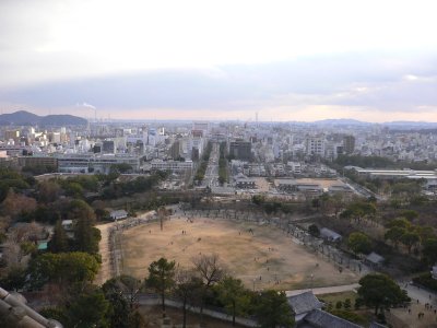 中央にある直線の道路は姫路駅と姫路城を結ぶ。