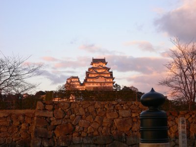 日も沈みかけた夕焼け空にたたずむ姫路城。