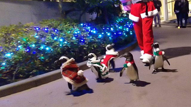 クリスマス風におめかししたペンギンがヨチヨチ歩き。